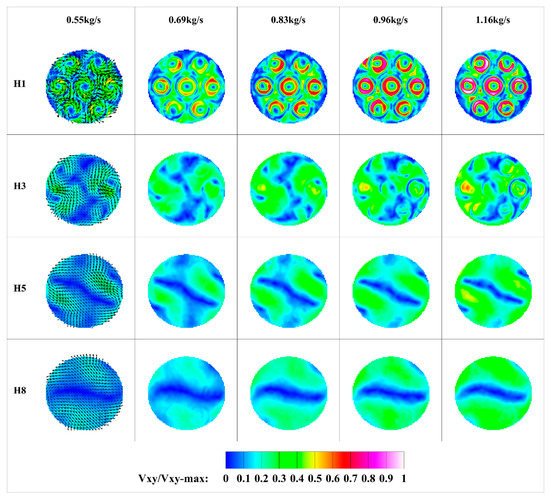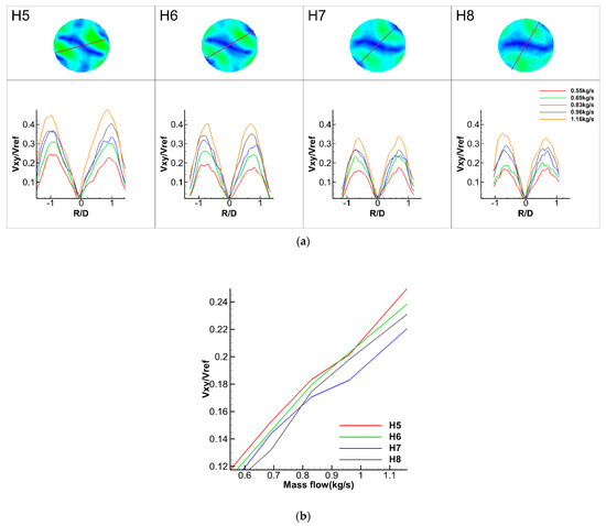 To quantify the self-similarity of the cross-sections, the velocity data of cross-sections H5–H8 were taken for analysis. Data on a selected diameter moving through the high-velocity area were selected in different working conditions, as shown in Figure 14a, where the red line represents the position of the data sampled. The comparison shows that the Vxy trend of the cross-section H5–H8 sampling points was consistent under different working conditions. The average Vxy on the plane against the inlet mass flow rate was plotted, as shown in Figure 14b. The average velocity on the extracted line from each cross-section was basically linear with the mass flow rate. These comparisons suggest that, in the experimental model, the flow pattern remained constant, and the increase in mass flow only changed the magnitude of the absolute velocity, suggesting the stability of the flow.