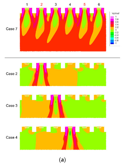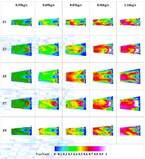 Velocity data for five working conditions and nine longitudinal sections were taken in this experiment; some of the velocity contours are shown in Figure 15. The longitudinal section measurement results also show the self-similarity in x–z velocity distribution in the combustion chamber. Another phenomenon of flow in the combustion chamber is shown: the swirling flows form recirculation zones downstream of each nozzle.