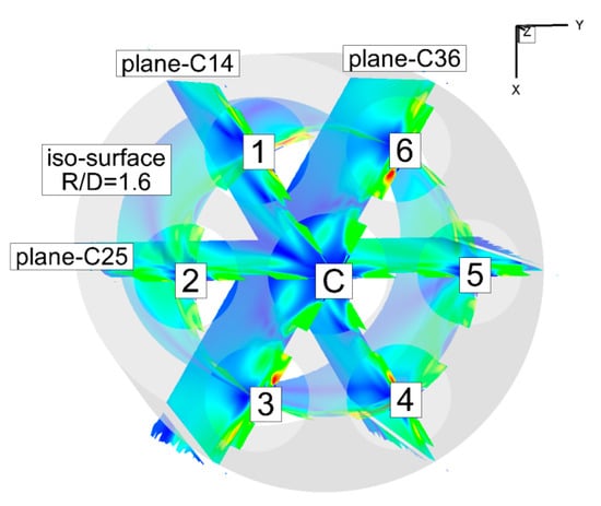 The CFD results of the four planes were focused on, as shown in Figure 16. Planes C14, C25 and C36 crossed the axes of two surrounding nozzles and the central nozzle. For example, plane C14 indicated that the plane went through the axes of nozzles C, 1 and 4. Iso-surface R/D = 1.6 crossed the axes of six surrounding nozzles. Because the flows of surrounding nozzles 2 and 5 were clockwise (looking from the back) and the other nozzles flowed counterclockwise, the coupling effect between the surrounding nozzles with different directions and the central nozzle can be obtained by comparing variables on plane C14, C25 and C36. Iso-surface R/D = 1.6 passed through the surrounding nozzle axes, and the information on the curved surface reflected the interaction between surrounding nozzles with different directions. The curved surface was expanded into a 2D plane for easier expression. Three variables are discussed. Vxy (velocity on the x–y plane) is used to reflect the swirl velocity, Vz (velocity on z direction) gives velocity information about recirculation and TKE (turbulent kinetic energy) is analyzed to reveal the turbulent mixing between the recirculation zone and the mainstream area.