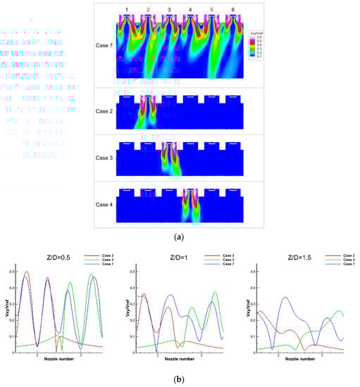 Vxy on planes. (a) Vxy on Iso-surface R/D = 1.6 in different cases; (b) Vxy between nozzle 2 and 3 in Case 2, Case 3 and Case 7; (c) Vxy between nozzle 3 and 4 in Case 3, Case 4 and Case 7.