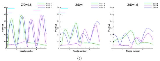 As can be seen from Figure 17a, when the two adjacent nozzles had the opposite direction, the swirling flow between nozzles reached a higher speed and gradually fuses; when the two adjacent nozzles had the same direction, there was no fusion between the separate flows, and the swirl was relatively independent. Taking nozzles 2, 3 and 4 as examples, nozzles 2 and 3 flowed in opposite directions while nozzles 3 and 4 flowed in the same direction. When Z/D = 1.5, there was only one high-velocity peak between nozzle 2 and 3 after coupling (Case 7), as shown in Figure 17b, while two low-speed peaks remained between nozzle 3 and 4 after coupling, as shown in Figure 17c. The coupling of nozzle flows of different directions generated a swirl whose speed was much higher the original, while the coupling of the nozzle flow with the same direction generated a swirl whose speed was at the same level as the original swirl. This phenomenon did not appear at the entrance of the combustion chamber. At Z/D = 0.5, the nozzle flow was quite similar before and after coupling. The coupling effect manifested when the flow further developed. The same phenomenon can be observed between the central nozzle and the surrounding nozzle.