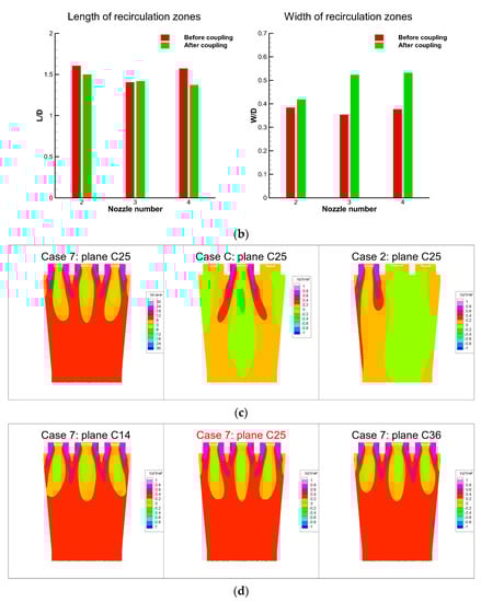 The generation of the recirculation zone is one of the main phenomena inside the combustion chamber, which is important for stabilizing the flame. Figure 18a,c,d shows the z-velocity on each plane, and Figure 18b shows the length and width of the recirculation zones downstream of nozzles 2, 3 and 4 before and after coupling.