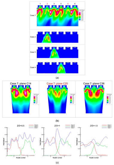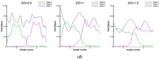 TKE information. (a) TKE on Iso-surface R/D = 1.6 in different cases; (b) TKE on different planes in Case 7; (c) TKE between nozzle 2 and 3 in Case 2, Case 3 and Case 7; (d) TKE between nozzle 3 and 4 in Case 3, Case 4 and Case 7.