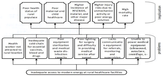 The World Health Organization (WHO) makes it known that good healthcare service directly depends on access to a reliable electricity supply, and saving a life without electricity will be difficult [1,6,12,22,23]. Figure 1 shows the effect of unreliable energy access on rural healthcare services [24].
