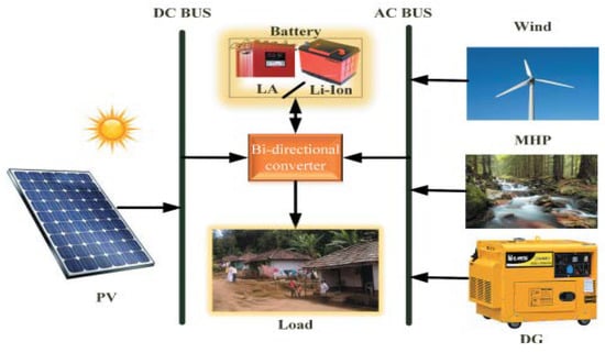 Additionally, a recent study demonstrated the economic and technical feasibility of hybrid renewable energy systems, indicating the cost-effectiveness of Solar PV/Wind/DG/Battery that achieved CO2 emission reduction and reliable power supply to make a case for renewables [37]. In the typical off-grid Hybrid Renewable Energy System (HRES) shown in Figure 2, the battery provided is considered for storing excess energy via a converter attached to the system. The converter provides ports for AC and DC output loads since it can receive AC and DC power as input.