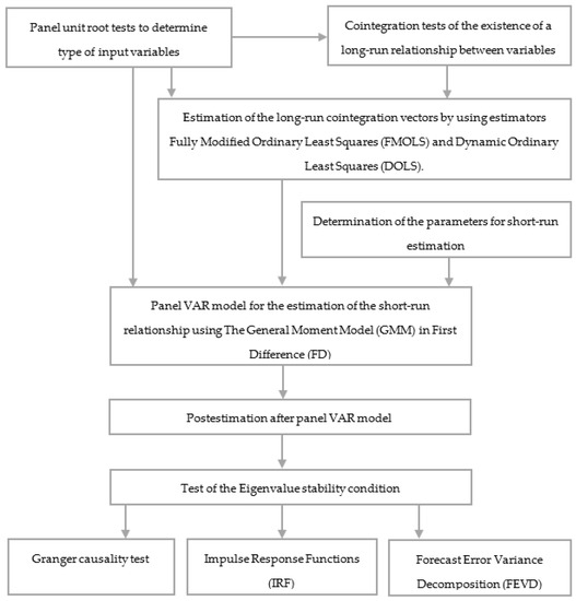 For the same reasons, we use the PVAR model as described in [38], including: (I) the possibility of evaluating the reaction of our investigated variable, i.e., CO2 emissions, to a one standard deviation shock on all the explanatory variables; (II) the ability to evaluate the contribution of all the variables of the system to the variability in CO2 emissions by using forecast error variance decomposition (FEVD); and (III) the PVAR model allows the analysis of the causality direction between all the models under the study framework.