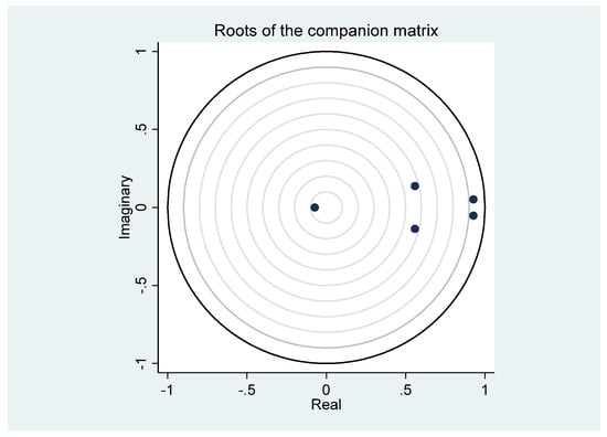 An important prerequisite for the implementation of the PVAR model is the eigenvalue stability condition. Lütkepohl [80] shows that a VAR model is stable if all moduli of eigenvalues of companion matrix A (type k × p) are strictly less than 1.