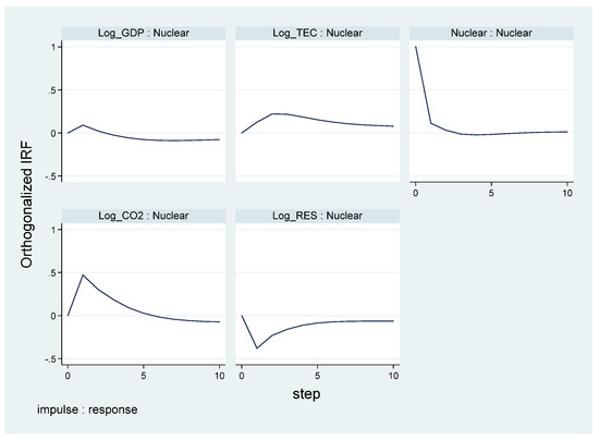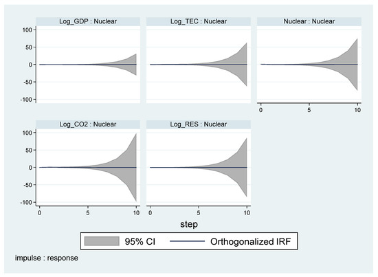 In the third step, we used the panel vector autoregression (PVAR) model [70] following [71] and the Granger causality test [72] to analyse the relationship between CO2 emissions, gross domestic product, energy consumption, renewable energy consumption and nuclear energy consumption in the short run. The coefficients of the PVAR model were estimated using general moment methods (GMMs) within a first difference (FD) model.