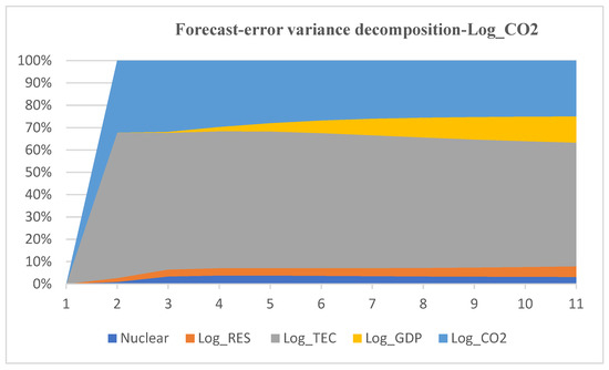 Forecast error variance decompositions (FEVDs) determine how much of the variance of the forecast errors of each variable can be explained by exogenous shocks to the other variables. The FEVD is part of a structural analysis that “decomposes” the forecast error variance into the benefits of specific exogenous shocks. According to Abrigo and Love [71], the h-step ahead forecast error can be expressed as follows: