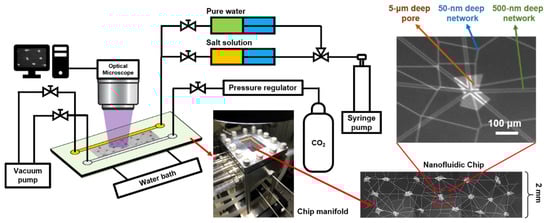 To provide a nanometer pore-scale physical micromodel of the shale reservoir, we fabricated a nanofluidic chip considering three levels of pore features (Figure 1): (i) a 50-nm deep interconnected network (fabricated as 52.7 ± 4.6 nm for the channel depth and 2 μm for the channel width) to simulate the connected nanometer pores in shale matrix; (ii) a 500-nm deep interconnected network (fabricated as 516.1 ± 9.8 nm for the channel depth and 20 μm for the channel width) to simulate the nanometer natural fractures in shale; (iii) 5-μm deep pores (fabricated as 5.1 ± 0.1 μm for the pore depth and approximately 100–300 μm for the equivalent diameter on the chip surface) to simulate large dissolution pores in shale. For all fabricated features, the depth of the feature is the governing dimension for the fluid transport and salt precipitation. The width of the feature provides visibility to distinguish different phases (CO2, water and salt) under the microscope. The nanoporous media flank two main microchannels to supply testing fluids (salt solution, pure water and CO2). The width of the entire nanoporous media is 2 mm. To fabricate the nanofluidic chip, we repeated photolithography and reactive ion etching three times. After that, we performed anodic bonding and chip dicing. The detailed multiscale chip fabrication methods are delineated in our previous work [32,33].