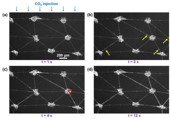 Salt precipitation in the 500-nm deep network and 5-μm deep pores during CO2 injection at constant pressure (1 MPa). (a–d) are recorded images of salt precipitation at approximately 1, 3, 4 and 12 s. The white particles are the precipitated salt contents. The yellow and red arrows indicate salt precipitations in the 500-nm deep network and 5-μm deep pores.