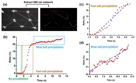 Salt precipitation dynamics in the 500-nm deep network. (a) Image analysis to extract precipitated salt particles in the 500-nm deep network. (b) the occupancy of the salt particles in the 500-nm deep network. The ratio is defined as the total volume of the precipitated salt divided by the total volume of the 500-nm deep network in the observation area. (c) Fast salt precipitation and its linear fitting result (slope = 9.1 ± 0.5, R2 = 0.95). (d) Slow salt precipitation and its linear fitting result (slope = 0.37 ± 0.02, R2 = 0.89).