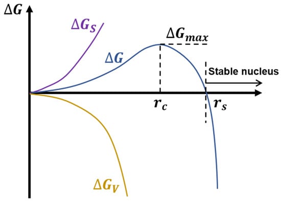 Here is positive and inhibits the nucleation, as the additional interfacial energy generated by the nucleus is unfavorable in a thermodynamic system. is negative and promotes the nucleation, because ions have lower chemical potential in the precipitated salts () compared to in solution () at supersaturation. Equation (7) can be further derived as a function of the nucleus radius ():