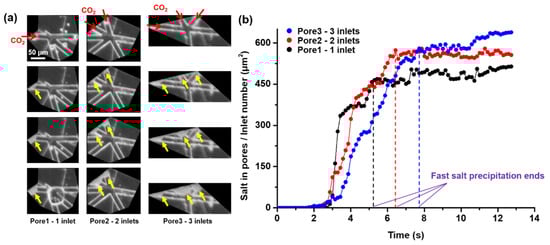Salt precipitation and accumulation in the 5-μm deep pores. (a) Recorded salt precipitation and accumulation results in three individual pores with 1–3 inlets. (b) Salt particle accumulation dynamics in three pores.