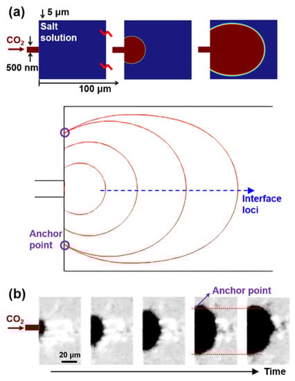 To further analyze the salt accumulation dynamics in pores, we performed the phase-field simulation [42] to evaluate the gas chamber in the pore during CO2 injection, as shown in Figure 6a. The 2D simulation captures the governing dimension (depth) of the channel (500 nm) and pore (5 μm). We set the pore length as 100 μm, which is the magnitude of the equivalent diameter of the pore on the chip surface. In the simulation, there is also a 500-nm outlet nanochannel for the solution to be displaced, which is not plotted in Figure 6a. We chose the fluid properties, including viscosity, density and interfacial tension of CO2 and salt solution at 70 °C and 1 MPa, and set the CO2 injection pressure as 1 MPa. It is noted that during the experiment, we can only observe the salt precipitation from the top side of the nanofluidic chip. The simulation applies the geometry of the governing dimension (depth). We only used simulation results for qualitative analysis instead of quantitative comparison.