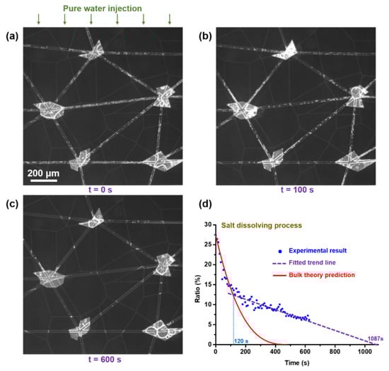 Salt dissolution dynamics in the 500-nm deep network. (a–c) are recorded images of salt dissolution at 0, 100 and 600 s. (d) Experimental results of the salt dissolution process, classical bulk dissolution theory prediction and fitted trend line based on experimental results.