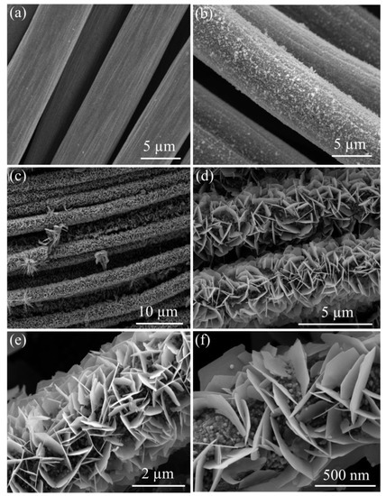 FESEM images of (a) CC; (b) ZnO@CC; (c,d) Low-magnification FESEM images of CoFe-LDH@ZnO@CC; (e) High-magnification FESEM images of CoFe-LDH@ZnO@CC; (f) an enlarged view.
