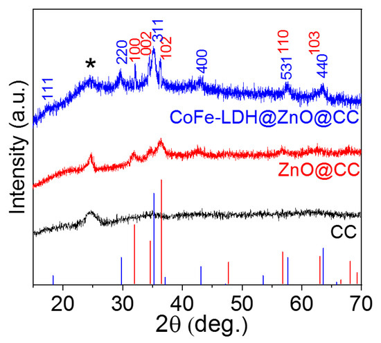 XRD patterns of CC, ZnO@CC, and CoFe-LDH@ZnO@CC (Asterisk denoted the peaks generated form CC).