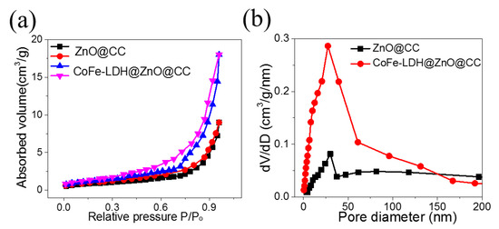 (a) N2-sorption isotherms of ZnO@CC and CoFe-LDH@ZnO@CC; (b) BJH pore-size distribution of ZnO@CC and CoFe-LDH@ZnO@CC.