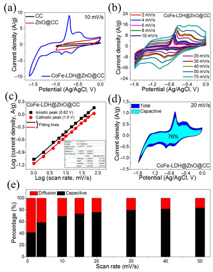 (a) CV profiles of the CC, ZnO@CC, and CoFe-LDH@ZnO@CC samples; (b) CV profiles of ZnO@CC and CoFe-LDH@ZnO@CC at different sweep rates; (c) Calculation of b-values log(current density) versus log(sweep rate); (d) Percentage diffusion/capacitive mechanisms of CoFe-LDH@ZnO@CC; (e) Percentage contribution of diffusion/capacitive mechanisms at different sweep rates (1–50 mV/s) for CoFe-LDH@ZnO@CC.