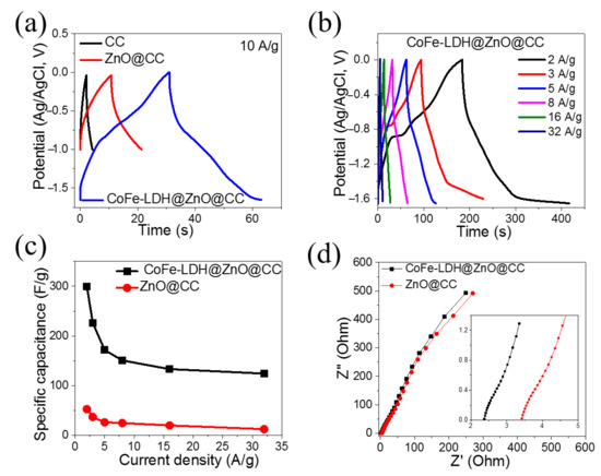 (a) GCD profiles of CC, ZnO@CC, and CoFe-LDH@ZnO@CC; (b) GCD profiles of CoFe-LDH@ZnO@CC at 2–32A/g; (c) Capacitance of ZnO@CC and CoFe-LDH@ZnO@CC vs. current density; (d) EIS plots.
