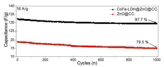 The cyclic life of both samples was evaluated at 16 A/g. The cyclic stability of the ZnO@CC and CoFe-LDH@ZnO@CC electrodes (Figure 7) shows that the CoFe-LDH@ZnO@CC electrode exhibited a capacitance retention of 97.7% for 1000 cycles, whereas ZnO@CC demonstrated retention of 79.5% for 5000 cycles. Thus, the CoFe-LDH@ZnO@CC electrode has exceptional cyclic performance.