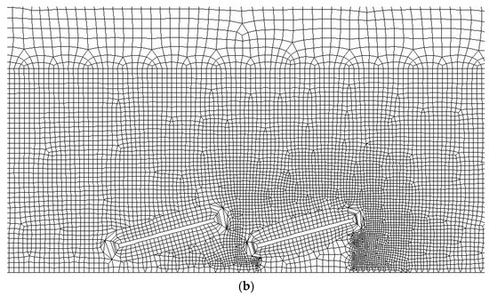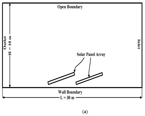 A computational domain of 30 m × 10 m = 300 m2 was considered, as shown in Figure 3a. A 1:1 Scale model was developed using an ANSYS Fluent geometry tool. For each type of configuration, two rows of solar panels wereconsidered in a 2-D domain (Figure 3a,b). The size of the panels considered was 2 m × 1 m × 40 mm. The parametric design approach was used in which the tilt angle of each row and the pitch between them wereparameterized and couldbe adjusted according to the requirement. Simulations werecarried out using the two-equation k-Ɛ model. The computation domain was subdivided into control volumes for better mesh generation. A multi-zone Quad/Tri mesh was generated. Grid independence study results are presented in Table 2. Three types of mesh, coarse, medium, and fine, wereused to calculate the lift coefficient. The results formedium and fine mesh wereapproximately the same. Therefore, the medium mesh was used for the final results evaluation. Furthermore, to obtain better results, near-wall treatment was performed around the photovoltaicpanels, and refinement was done in the region of interest, i.e., the area around the solar panel, as shown in Figure 3b.