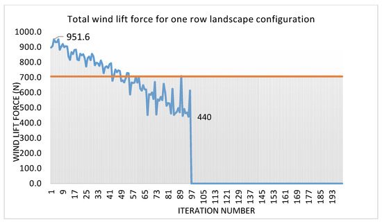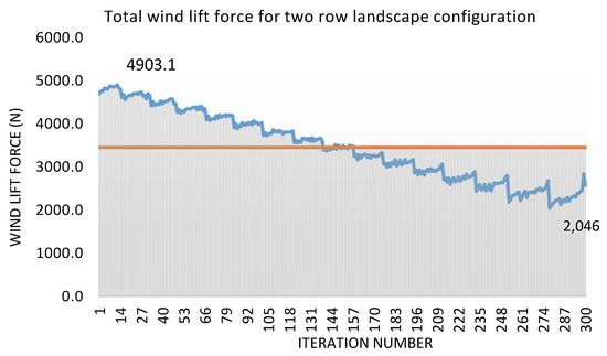 The total population size, in this case, was 4096. The genetic algorithm method was used to find the optimum configuration. Around 10% of the population (400 individuals) was analyzed before achieving an optimum configuration. Figure 11 shows the results obtained for each iteration.