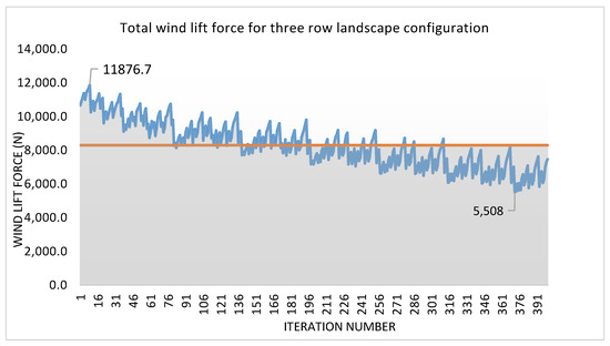 In the final case, three rows of solar panels in landscape orientation, as shown in Figure 10, were analyzed to find an optimum configuration by varying tilt angles of the first and second rows in the range of 15 to 30 degrees, with an interval spacing of one degree and pitch between the rows from 3 m to 4.5 m with interval spacing of 0.1 m.