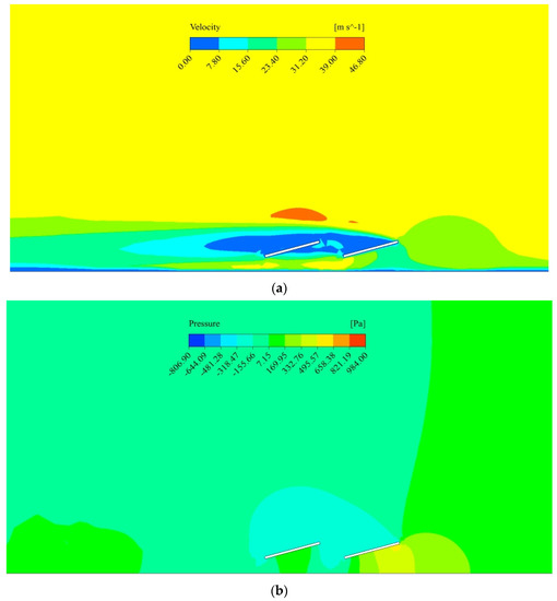 Case I—CFD simulation results for optimum configuration (a) velocity contour; (b) pressure contour.