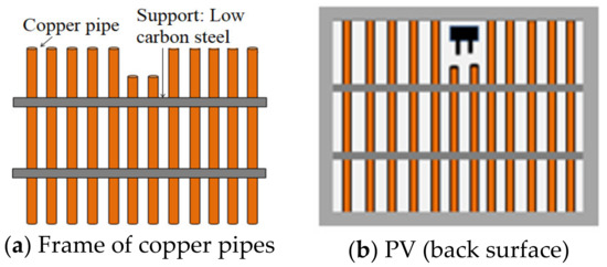 Figure 1. (a) Copper multi-pipe cooling frame, (b) PV integrated with passive cooling system.