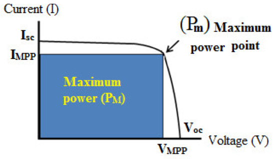 Each PV setup is operated over a wide range of voltage and current for finding the maximum power output (Pm) and then PCE for a particular level of irradiation. The resistive load at that particular irradiation is increased from zero (short circuit) to a significantly high value (Open circuit) to determine the maximum power point by plotting I-V curve as shown in Figure 2. The maximum power output (Pm) is obtained from the maximum power point of the I-V curve. The value of PCE is determined by using Equation (1). The incident power (Pi) is determined by the product of the PV module surface area Am in m2 and the incident solar radiation energy (E) in W/m2. The value of solar radiation (E) is obtained from solar meter. The short circuit current and open circuit voltage as shown in I-V curve are denoted by Isc and Voc, respectively. The voltage and current at maximum power point (Pm) are presented by IMPP and VMPP, respectively. The maximum power out (Pm) is the area of the product of maximum current (IMPP) and maximum voltage (VMPP) obtained at Pm. These values are used to calculate the fill factor (FF) by using Equation (2). The final form of PCE is presented by Equation (3).