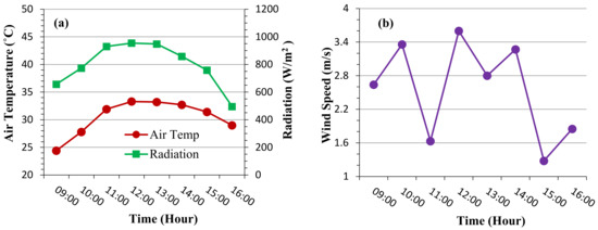 Figure 3 presents the variation of solar radiation, ambient temperature, and wind speed with respect to time over the test day, from 9:00 a.m. to 4:00 p.m. The trend of the ambient temperature change follows the change in solar radiation indicating direct dominance of the ambient temperature by the solar radiation. However, the wind speed shown in Figure 3b varies randomly over time and does not follow the pattern of solar radiation. With the increase of solar radiation, the ambient temperature is found to increase until 12:00 p.m., and then the temperature and the solar radiation decrease with similar trends. The ambient temperature (33.3 °C) and the radiation (955 W/m2) are found to be maximized at 12:00 p.m. The variation in ambient temperature is directly caused by solar radiation, whereas the wind speed, location, and season have indirect influence on it.