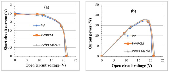 Figure 6 reveals that the efficiency of the conventional PV module is 12.69% under the radiation of 773.4 W/m2 at 12:00 p.m. Under similar conditions, the PV system integrated with ZnO/PCM shows an electric efficiency of 12.94% with a filling factor, FF = 73.33%, an open circuit voltage, Voc = 20.95 V, a short circuit current, Isc = 2.91 A. The high value of the electrical efficiency observed for the PV system integrated with ZnO-doped PCM demonstrates that the ZnO/PCM-integrated PV system can effectively reduce the adverse effect of module surface temperature. Although the ambient temperature and module surface temperature were found to be high at 12:00 p.m., the efficiencies at this noon time presented in Figure 6 are found to be higher than those at 10:00 a.m. and 3:00 p.m. In fact, this feature leads to a better and controlled thermal output during the application period of the PV solar system.