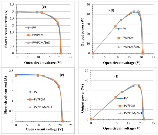 Figure 4. Plots of I-V curves (a,c,e) and variation of power outputs (b,d,f) for the PV systems in the presence and absence of PCM and ZnO-doped PCM at 10:00 a.m. (a,b), 12:00 p.m. (c,d), and 3:00 p.m. (e,f).