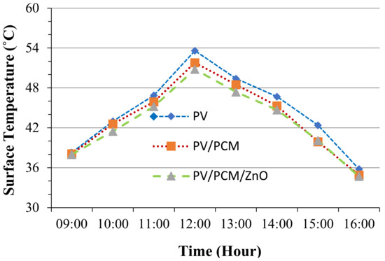 Figure 5 illustrates the variation of the module surface temperature with respect to the test time for different PV systems. It is seen that the surface temperature is gradually increased from 9:00 a.m. to 12:00 p.m. and then reduced until 16:00 p.m. The maximum surface temperatures of the PV system and the ZnO-doped PCM integrated PV system are found to be 53.6 °C and 50.8 °C, respectively, at 12:00 p.m. This demonstrates that the attachment of a copper multi-pipe system with ZnO-doped PCM decreases the temperature by around 2.8 °C, which is an approximately 5.22% reduction from the PV module surface temperature.