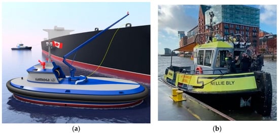 In the literature, one can find concepts of autonomous tugboats using various technologies. One example is the tugboat RAmora designed by Robert Allan Ltd. (Figure 1a). The tugboat RAmora is controlled by teleoperation from a remote position manned by the operator.