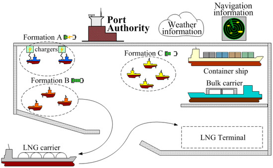 Figure 3 shows an example of a port with three formations of tugboats: A, B, C. Formation A consists of two tugs that are currently loading their energy storages, and their charge level is low for now. Formation B consists of three tugboats; their energy stores are high, and the formation is currently off-duty. The last of the formations, consisting of four tugs, Formation C, has just completed a container ship mooring operation, is at medium charge, and is available.