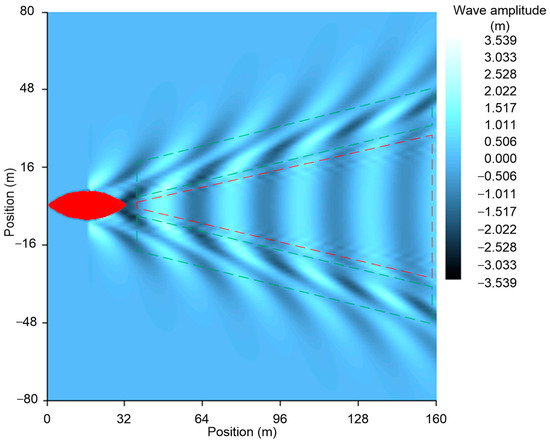Figure 4 shows an exemplary image of the wave heights generated by the movement of a single tugboat at a speed of 13 knots, made using the Michlet program [40]. The wave height in meters was depicted using a color gradient scale. The values on the vertical and horizontal axes represent distances in meters. A system of transverse waves is visible, marked with a red frame, and two symmetrical diagonal wave systems are marked with green frames.