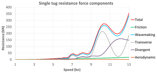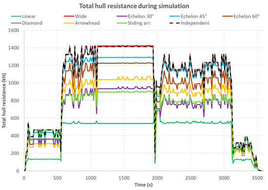 As a result of the implementation of Equation (9) to the speed parameters of the tugboat obtained as a result of the simulation, data on the resistance to which the formation of four tugboats would be subjected was obtained. The obtained results are presented in Figure 23: