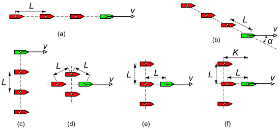 The development of modern technologies of automatic vehicle control allows the use of energy-saving mechanisms that were impossible or impractical in the case of fully manual control. One example may be the formation of road convoys (platoons) [22,23] by autonomous cars moving on highways. Maintaining a constant, relatively short distance between moving vehicles reduces aerodynamic drag. From the available literature, it is known that the distances and mutual location of identical vessels flowing close to each other have a significant impact [24,25,26] on hydrodynamic resistance.