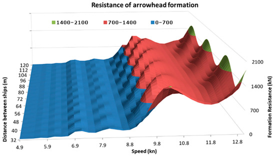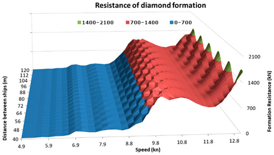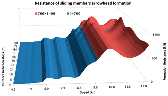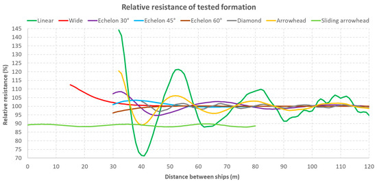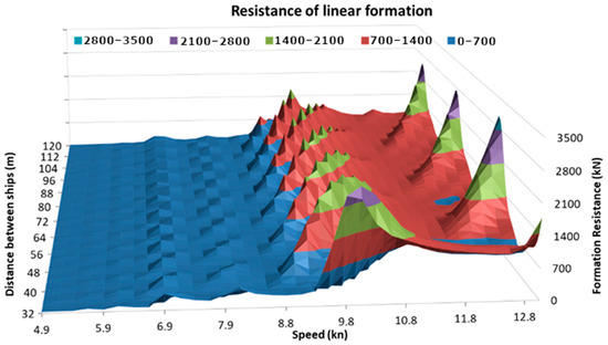 Due to the length of the tugboats of approx. 32 m, for a linear formation of length L = 32 m, the stern of the preceding tug would touch the bow of the next tug. It would make it possible to establish flexible connections between the tugboats for the duration of the formation’s movement, which would guarantee the maintenance of a predetermined distance and would enable the sharing of energy resources via common power network. Unfortunately, the research results show that sailing in such close proximity to each other significantly increases the total resistance. The use of such links would be possible if they could have a variable length of between two and 10 m (according to the diagram in Figure 15).