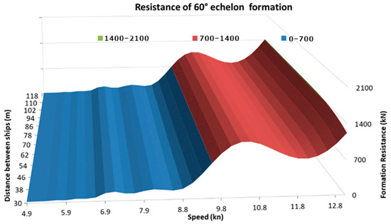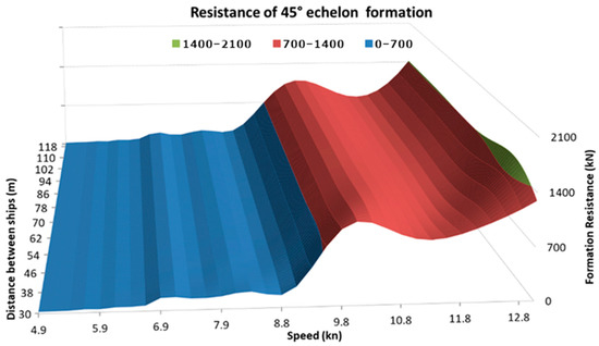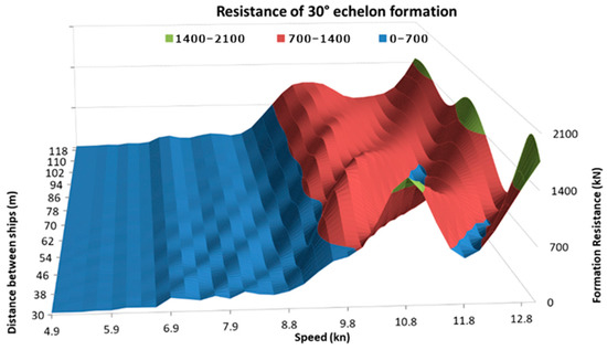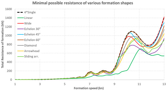 Figure 16 shows the plot of the FTmin(v) function for the speed range of 1 to 13 knots. It shows that the linear formation allows significantly reducing the resistance of four tugboats, starting from a speed of approx. 5 knots, up to a maximum speed of 13 knots. Only in the speed range of 11 ÷ 11.5 knots does the 30° echelon formation give slightly lower total drag.
