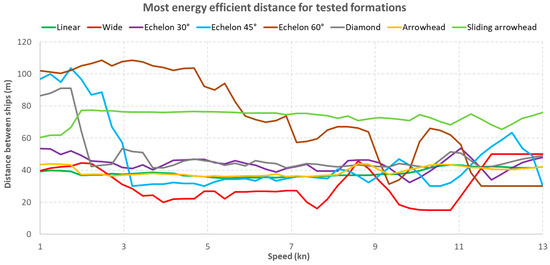 The results of the conducted research showed that the formation of a linear shape (Figure 6a), where the tugboats move one after the other, has a great potential to reduce energy consumption. In the presented example, for a linear formation, a reduction in energy consumption of 57.6% was obtained compared to four tugs sailing independently of each other. In second place in terms of consumption reduction is the echelon-shaped formation (Figure 6b) with a flare angle of 30°, with a result of 32.9%. The third-best formation is the arrowhead formation with sliding members (Figure 6e) with a result of 31.8%. The worst result is brought by the wide formation (Figure 6c), the use of which may result in an increase in energy consumption by 0.1% compared to independent tugboats. The 45° and 60° echelon formations, as well as the diamond-shaped formation and arrowhead formation, show a small reduction in energy consumption, on the order of between 5.8% to 24.5%.