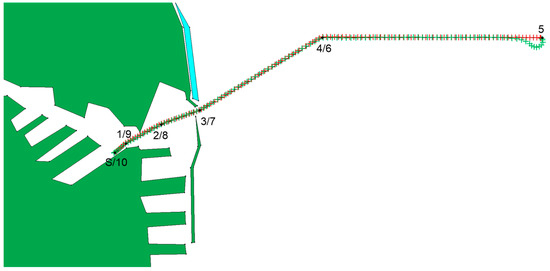 Figure 19 shows the route followed by the simulated tugboat. It consists of 10 waypoints, and after reaching waypoint 5, the tug makes a turn and returns along the same path. Therefore, some of the waypoints have the same coordinates. The preset route is shown with a dashed line, and the numbers shown correspond to the waypoint numbers. Figure 19 also shows position markers showing the trajectory of the simulated tugboat. The path shown in red represents tug movement from the starting position to waypoint 5, and in green from waypoint 5 to waypoint 10 (final position).