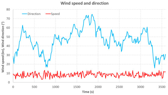 Figure 20 presents a graph of the speed of the tugboat relative to the water, obtained as a result of the simulation, and Figure 21 and Figure 22 show, respectively, the parameters of wind and sea currents acting on the tugboat during the simulated voyage.