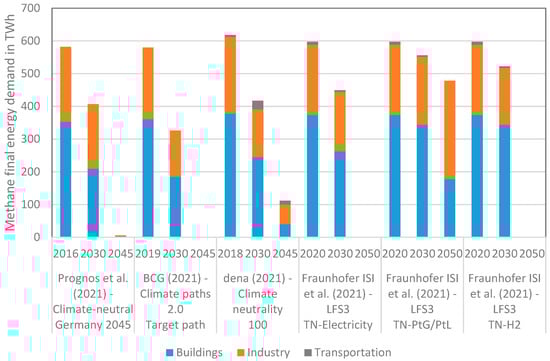 Development of the methane final energy demand in TWh. Authors’ illustration based on [,,,].