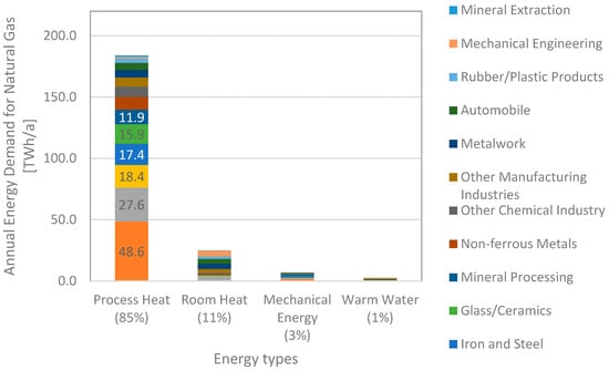 Today, German industry employs about 218 TWh of energy produced from natural gas []. The majority is required for process heating (85%) (see Figure 2). With 49 TWh for process heating in 2019, the basic chemicals industry is responsible for almost one quarter of the total natural gas demand. It is followed by the food and tobacco (27.6 TWh), pulp and paper (19.4 TWh), iron and steel (17.4 TWh), glass and ceramics (15.9 TWh) and mineral processing (11.9 TWh) industries. Together, these six industry branches are responsible for about 69% of the total natural gas demand in industry.