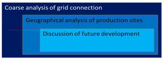 This paper provides a three-stage analysis starting with a coarse analysis and then increasing the level of detail with a geographical analysis of production sites and a discussion of future gas development. This approach is sketched out in Figure 3, illustrating in dark blue the rather rough estimation of the network connection level based on supplied gas per production site. In blue, the next, more detailed level of the geographical assessment of the industry production sites and the gas transportation network is depicted. Lastly, in light blue, the most detailed investigation concerning the alternatives to gas usage in the different industry branches and their timeline is shown.