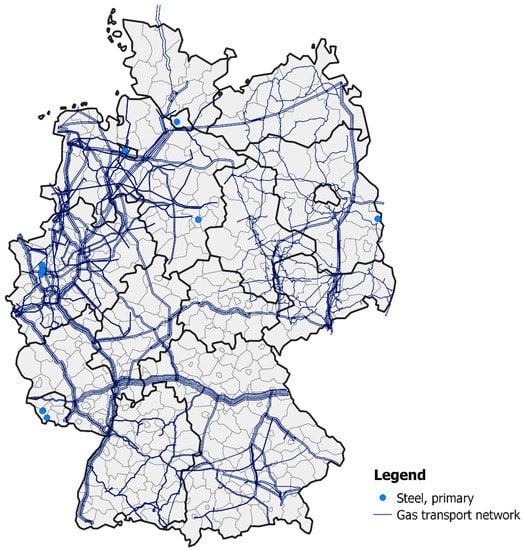 Figure 4 provides an overview of the seven primary steel production sites, grouping the production sites in North Rhine-Westphalia as one production site. Among these sites, five (out of seven) are not connected to the gas transportation network. Consequently, it can be assumed that these steel production sites are connected to a gas distribution network.